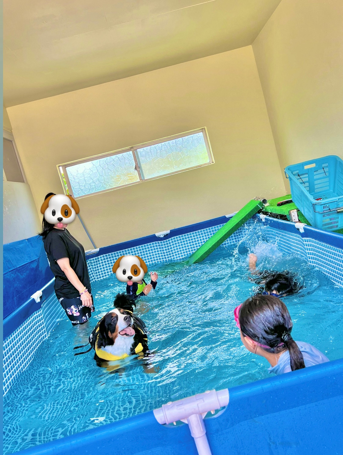 ・月2回、活動プログラムで犬とのふれあい体験があり、夏休み期間は一緒にプールに入ることもできます